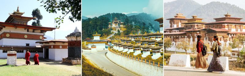 - Đèo Dochula: (cao 3,088m/10,130ft) nơi đây vị trí đẹp nhất để ngắm dãy núi Himalayas hùng vĩ và thơ mộng. Thưởng thức trà và cà phê miễn phí & Chiêm bái 108 ngôi đền xinh đẹp được xây dựng trên ngọn đồi bởi Nhà vua Ashi Dorji Wangmo vì sự an toàn và an khang của Nhà vua Bhutan.