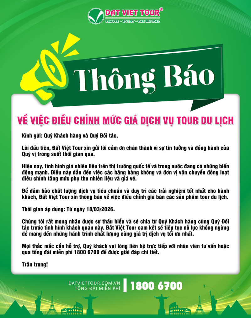 Đất Việt Tour rất mong nhận được sự thông cảm và chia sẻ từ Quý Khách hàng, Quý Đối tác trước những biến động mang tính khách quan của thị trường. Chúng tôi cam kết tiếp tục nỗ lực tối ưu chi phí, nâng cao chất lượng dịch vụ để mang đến những hành trình đáng giá và trải nghiệm tốt nhất.