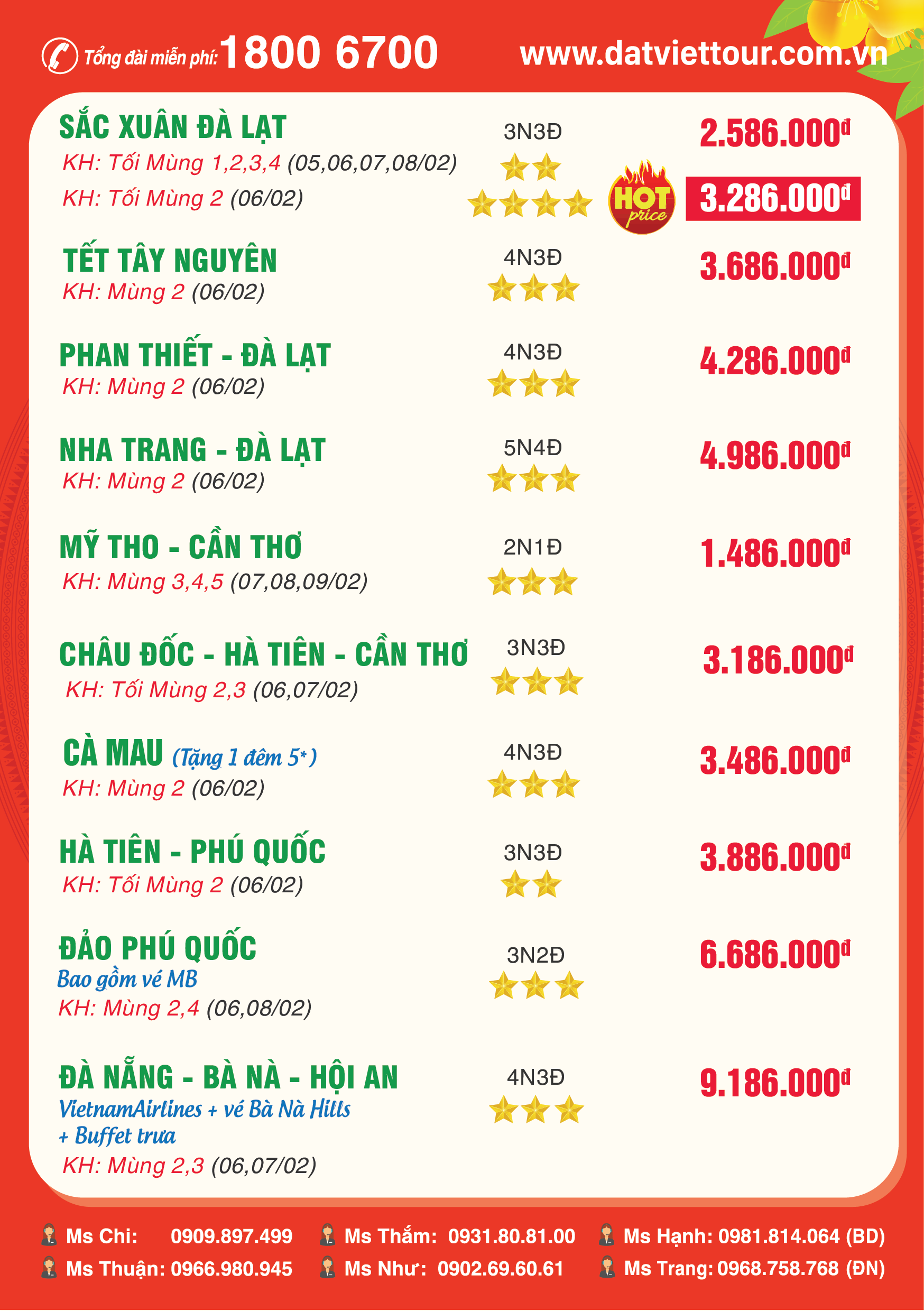 Đến văn phòng, chi nhánh Đất Việt Tour gần nhất hoặc đặt tour online tại địa chỉ website www.datviettour.com.vn hoặc truy cập fanpage Đất Việt Tour ngay hôm nay để nhận voucher cực hấp dẫn khi đặt tour du lịch Tết Nguyên đán 2019. Mọi thông tin, quý khách vui lòng liên hệ tổng đài: 1800-6700 (miễn phí cuộc gọi) để biết thêm thông tin chi tiết.