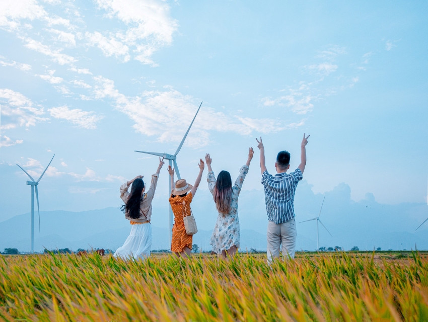 - Tubin Gió - check in với những cánh quạt gió màu trắng khổng lồ đang quay chầm chậm dưới nền trời xanh khiến cánh đồng quạt gió ở Bình Thuận này vừa có nét thơ mộng của Bàu Trắng, lại vừa hiện đại và sang chảnh như ở trời Âu.