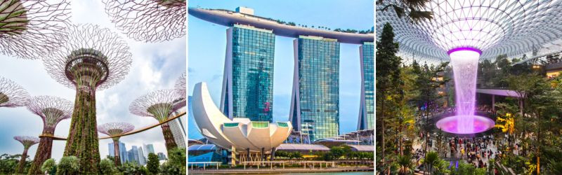 - Kỳ quan Gardens by the Bay (Những khu vườn bên Vịnh) đây là khu vườn nhân tạo rộng hơn 100ha, có hơn 250.000 loài thực vật quý hiếm, với các Siêu cây khổng lồ lấy năng lượng mặt trời vào ban ngày và tỏa sáng vào ban đêm. Từ đây Quý khách có thể chụp hình toàn cảnh “Chiếc du thuyền” nằm ở độ cao 200m trên đỉnh của ba tòa nhà khách sạn Marina Bay Sands.
