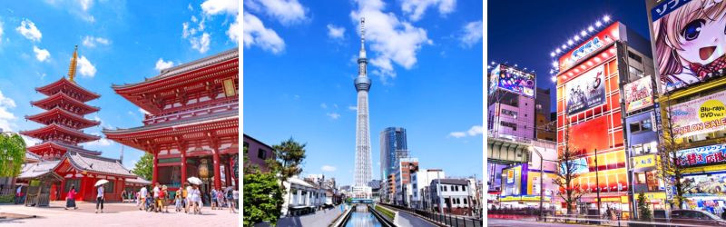 - Chùa Asakusa: ngôi chùa được xây dựng vào năm 645 dành riêng cho việc thờ phụng Bồ Tát Quán Âm (Quán Thế Âm). Là ngôi chùa cổ nhất Tokyo.