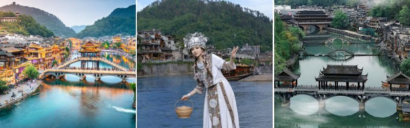 Sau đó, xe và HDV đưa đoàn khởi hành di chuyển đến Phượng Hoàng Cổ Trấn (được nhà văn Tân Tây Lan Alley Rewi khen ngợi là nơi đẹp nhất Trung Quốc, là một thành cổ nhỏ bé nằm ở tỉnh Hồ Nam - Trung Quốc, với những ngôi nhà cổ áp sát vào núi và soi mình xuống dòng Đà Giang).
