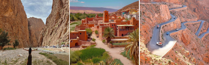Trên đường, Quý khách sẽ được nhìn ngắm vẻ đẹp của Thung lũng Dades, còn được gọi là thung lũng Mille Kasbhas, với những vách đá màu đỏ rực rỡ. Đoàn dừng chân tham quan thị trấn Kelaat M'Gouna (thuộc tỉnh Tinghir), còn được gọi là “Thung lũng hoa hồng” vì nơi đây có một nhà máy chưng cất hoa hồng và sản xuất nước hoa hồng, tinh dầu, và các sản phẩm mỹ phẩm từ hoa hồng, đặc biệt là lễ hội hoa hồng được tổ chức vào tháng 5.