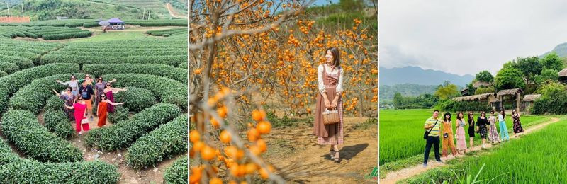 - Mộc Châu các mùa hoa trái: Tùy vào từng thời điểm, hướng dẫn viên sẽ đưa Quý khách đi chụp hình với những vườn hoa, vườn quả đặc trưng của Mộc Châu. Chắc chắn Quý khách sẽ ngỡ ngàng và ấn tượng trước những vẻ đẹp đầy sức sống và lôi cuốn ấy (Lưu ý: các vườn hoa vườn cây này như thế nào là hoàn toàn phụ thuộc vào thời tiết và kế hoạch trồng của người dân. Chúng tôi chỉ đưa Quý khách tới thăm khi vào mùa để chụp hình).