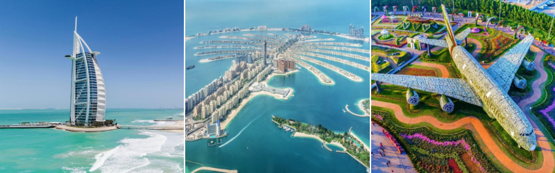 - Miracle Garden - Khu Vườn Kỳ Diệu và được mệnh danh là “hòn ngọc xanh mát” giữa sa mạc khô cằn, được bình chọn là vườn hoa lớn nhất thế giới với diện tích lên đến hơn 70.000 mét vuông. Khu vườn hội tụ 45 triệu bông hoa đủ màu sắc, chủng loại. Những bông hoa không chỉ được trồng thành từng cụm mà còn được sử dụng để tạo thành những tác phẩm nghệ thuật tuyệt đẹp như kim tự tháp, thảm hoa, ô tô hoa…