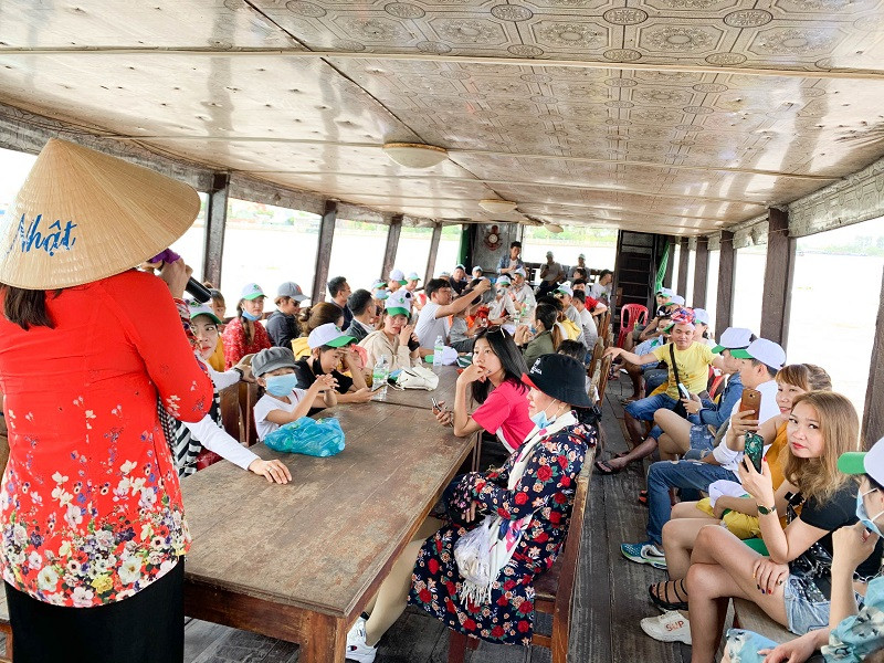 - Quý khách đi thuyền chèo 3 lá qua những con lạch nhỏ dười hai hàng dừa xanh mát trên sông, di chuyển ra thuyền lớn sang bờ Mỹ Tho thưởng thức trái cây tại nhà vườn, mật ong, kẹo và các sản phẩm từ dừa, nghe Đờn Ca Tài Tử.