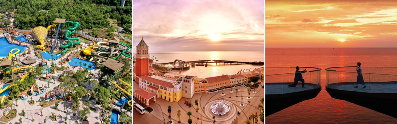 - Sunset Town: Với lối kiến trúc Địa Trung Hải nhưng không kém phần sang trọng, tất cả các công trình biểu tượng tại đây đều mang lại cho du khách cảm nhận như lạc vào một châu Âu thu nhỏ. Sự chăm chút tỉ mỉ của chủ đầu tư trong từng công trình, các chi tiết giả cổ cầu kỳ hoặc những tấm áo mới đầy màu sắc như: quảng trường còn Sò, đài phun nước Trevi, bút đá tháp Obelisk, ...