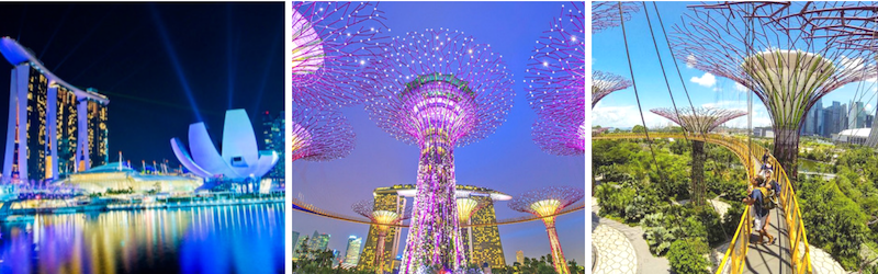 - Kỳ quan Gardens by the Bay (Những khu vườn bên Vịnh) đây là khu vườn nhân tạo rộng hơn 100ha, có hơn 250.000 loài thực vật quý hiếm, với các Siêu cây khổng lồ lấy năng lượng mặt trời vào ban ngày v`à tỏa sáng vào ban đêm. Từ đây Quý khách có thể chụp hình toàn cảnh “Chiếc du thuyền” nằm ở độ cao 200m trên đỉnh của ba tòa nhà khách sạn Marina Bay Sands.