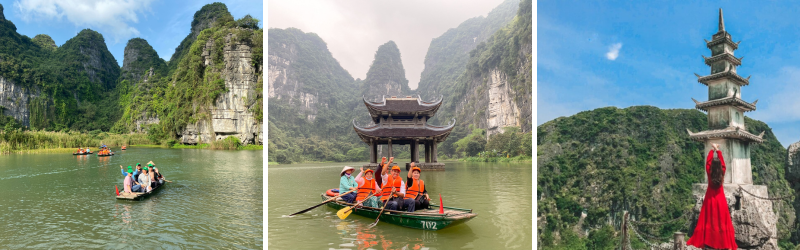 - Quần thể danh thắng Tràng An – Di sản được UNESCO công nhận là di sản văn hóa và thiên nhiên Thế giới, giúp cho Việt Nam lần dầu lọt vào danh sách 30 di sản hỗn hợp Thế Giới. Lên thuyền xuôi dòng Sào khê uốn lượn giữa cánh đồng lúa, nơi những dải đá vôi, thung lũng và những sông ngòi đan xen tạo nên một không gian huyền ảo, kỳ bí, quý khách đi đò tham Hang Sáng, Hang Tối, Hang Nấu Rượu…